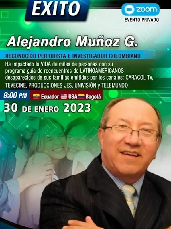 Alejandro Munoz, un investigador y periodista bogotano, dedicado a reunir familiares desparecidos; apoyado por su esposa Liria A. Benitez, quien ayuda en la comunicacion y preparacion en cada proceso de acercamiento.